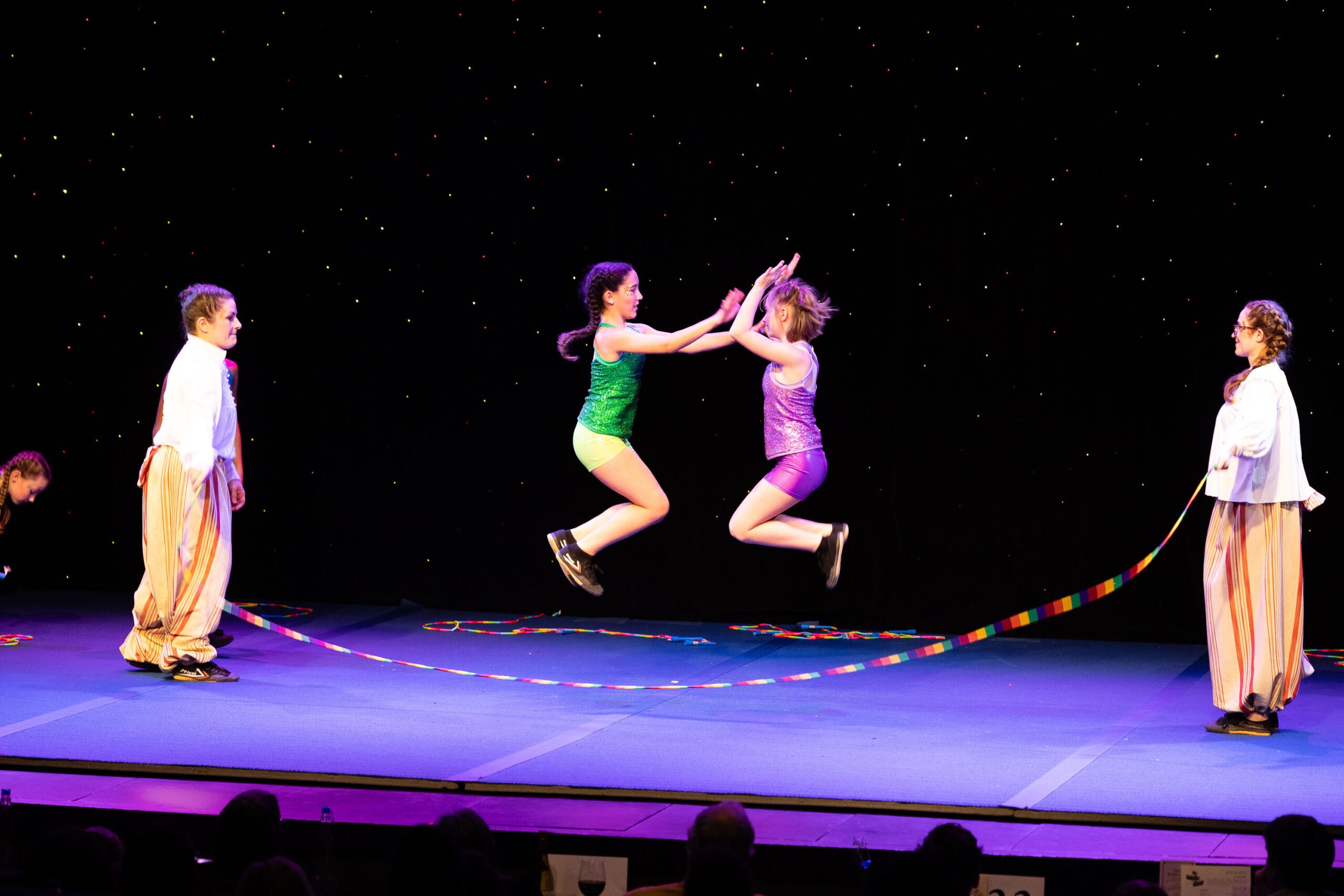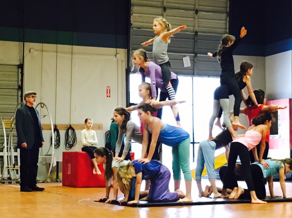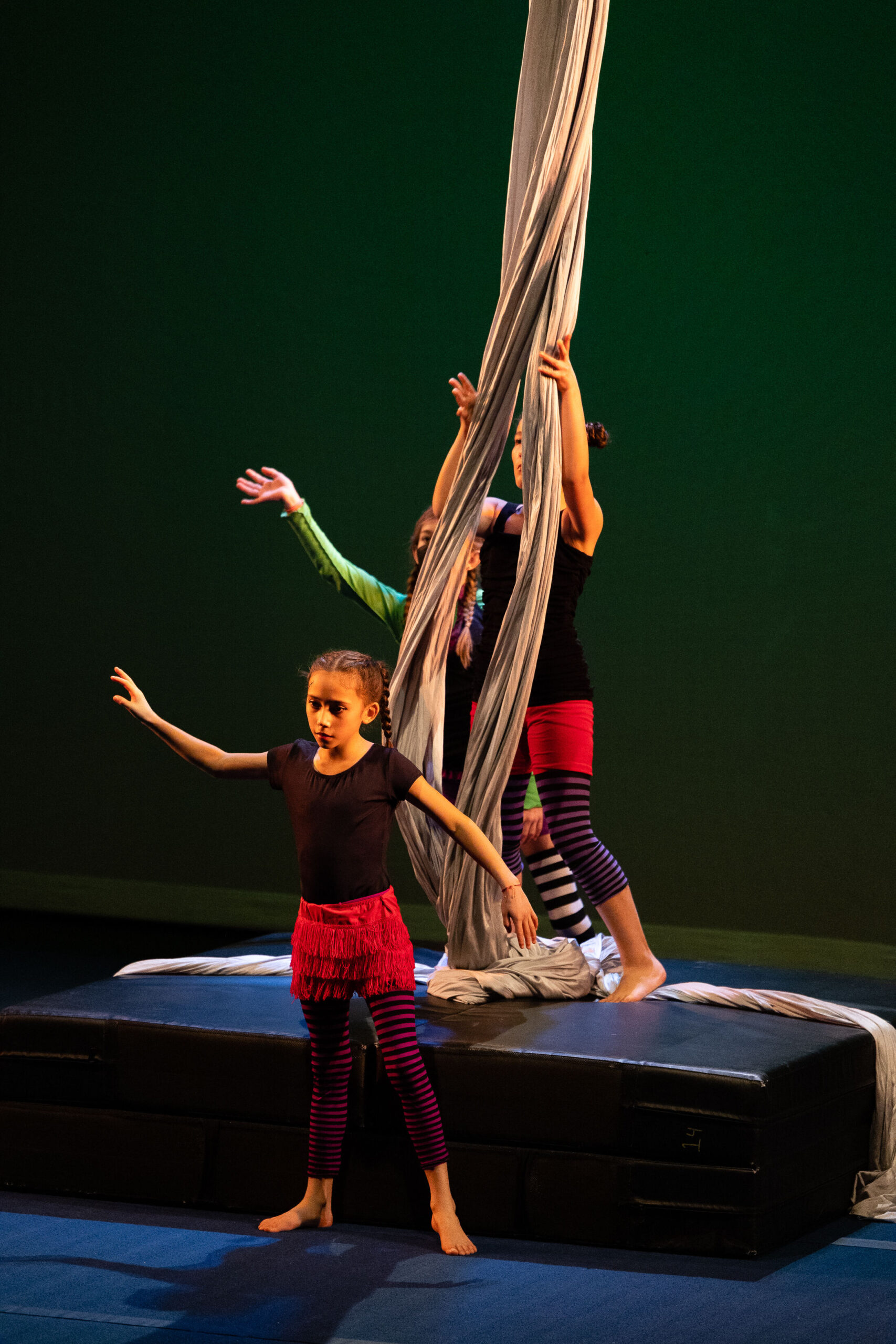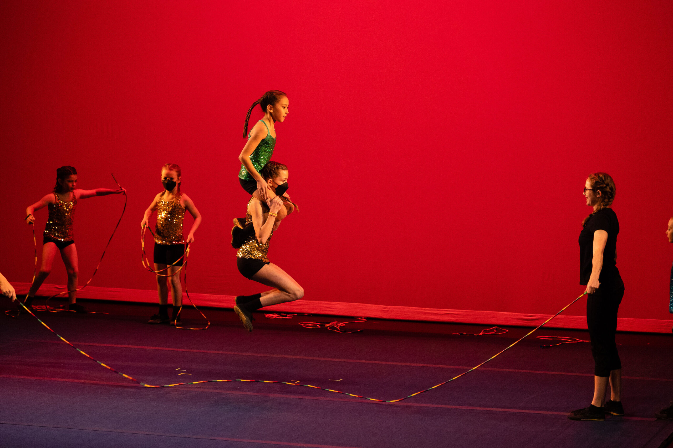 This troupe works together for several hours per week, creating acts in a variety of circus arts, including tumbling, group acro, tightwire, rolling globe, trapeze, aerial fabric, juggling, jump rope, mini-trampoline, unicycle, and contortion. At this level, the performers continue to develop their skills in working together with a troupe. They also begin to develop their own choreography for smaller group acts with guidance from their coaches.