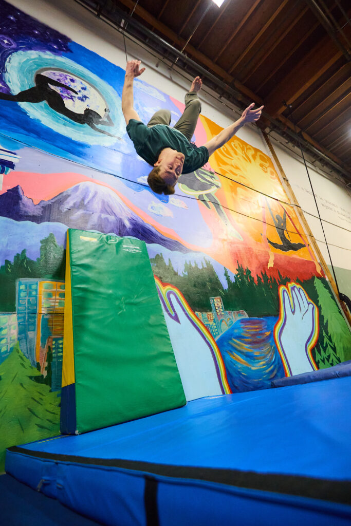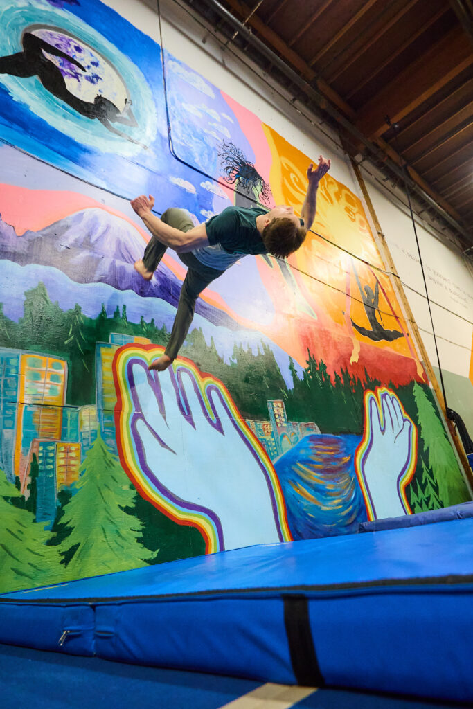 The Intensive will take place at Emerald City Trapeze Arts, located just south of downtown Seattle in the former Canal Boiler Works building in SODO. The space features padded flooring, numerous sets of safety/spotting lines, and a variety of crash mats.